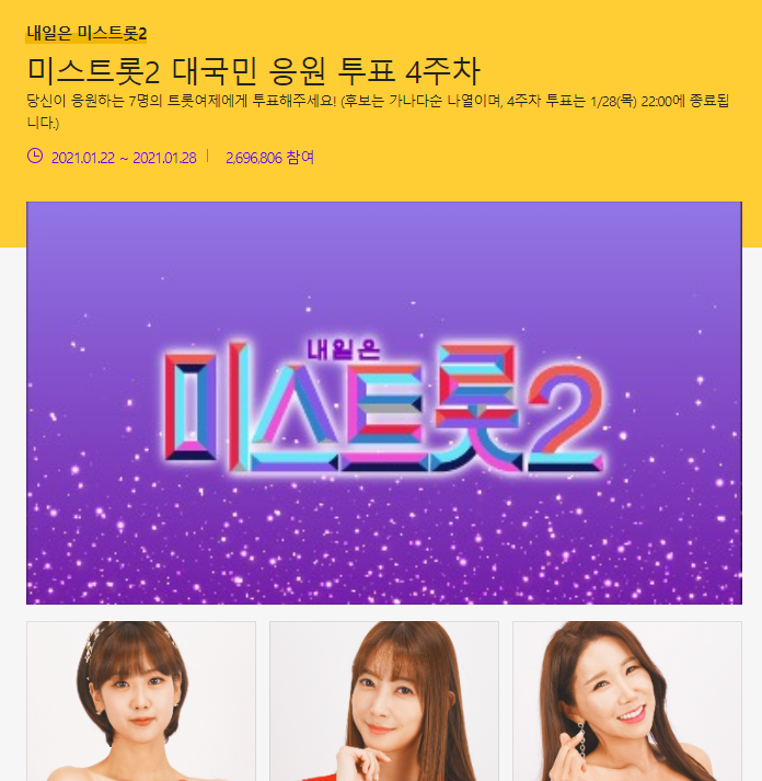 미스트롯2는 많은 인기를 끌고 있는 경연프로그램입니다 많은 분들이 미스트롯2를 보면서 각자 응원하는 가수에게 투표를 하고 있는데요 아직 투표를 하지못하신분들은 아래로 이동하셔서 투표를 진행하시면됩니다